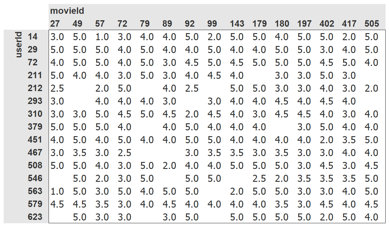 We have selected just a few of the most popular movies, and users who watch the most movies, for this crosstab example. The empty cells in this table are the things that we would like our model to learn to fill in. Those are the places where a user has not reviewed the movie yet, presumably because they have not watched it. For each user, we would like to figure out which of those movies they might be most likely to enjoy.